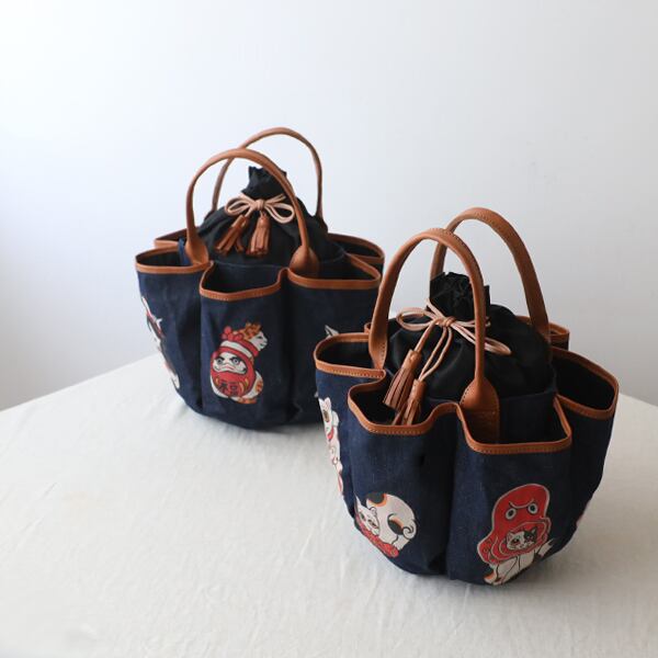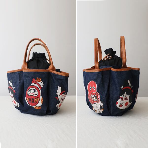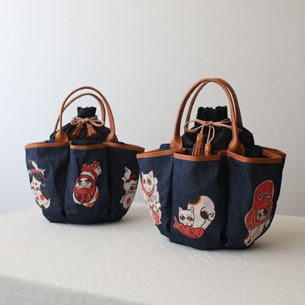 「手描き和画 鞄 縁起の良い猫さん /お花ポケットトート バッグ 」