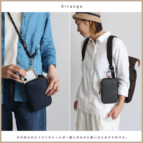 鞄に付けたり、斜め掛ショルダーポーチとして持ち歩くこともできます。