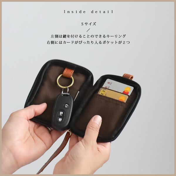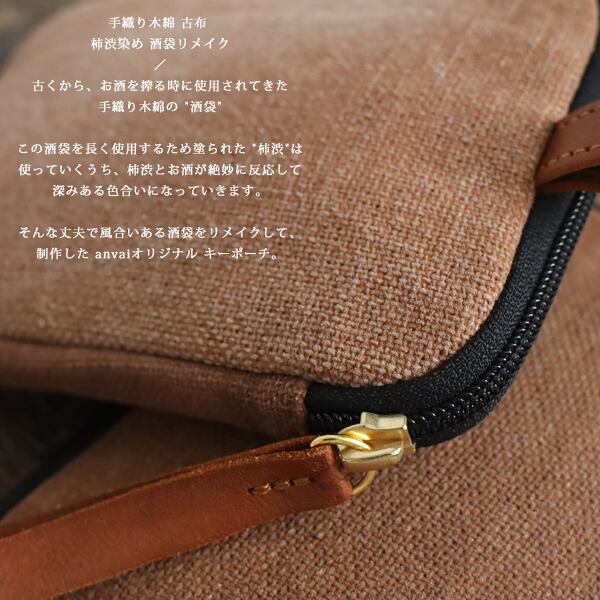 新作 Sサイズ 古布リメイク 酒袋 柿渋染め クッション入り キーケース カードケース ポーチ 牛革レザー S11A